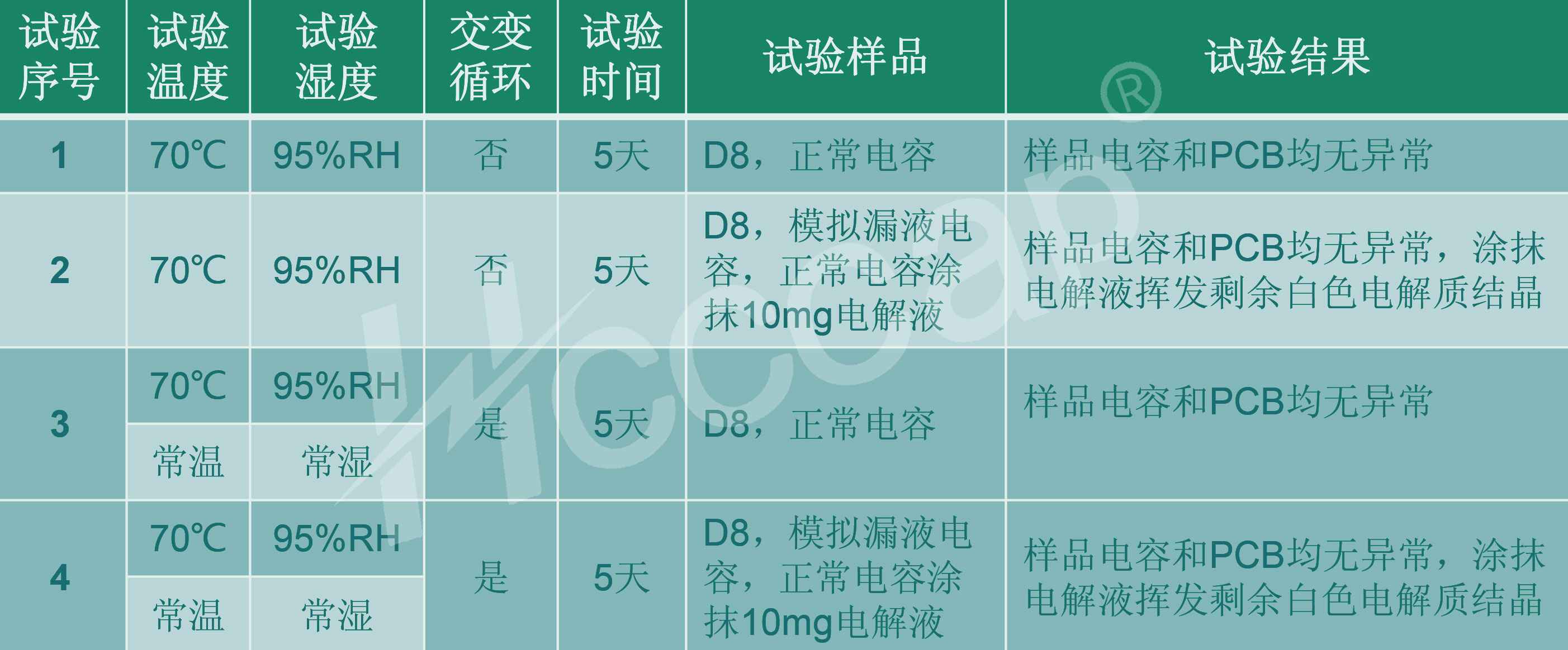 2.长时间高温高湿试验(高温使电容内部气压升高,电解液易渗出)